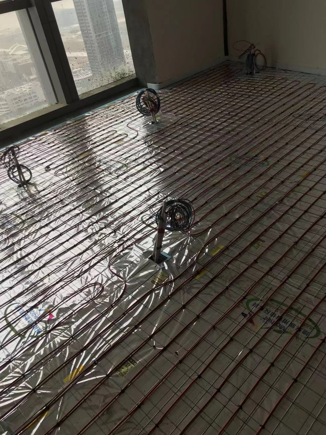 该项目为总部办公室地暖项目,采用丹麦丹佛斯双导电缆+绿羽全套环保辅材,合计采暖面积约有1800平方,为供电地暖所需要的负载甲方特意从一楼拉专用电缆上32层。